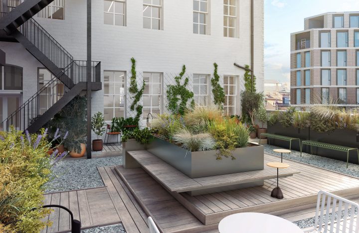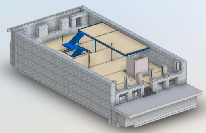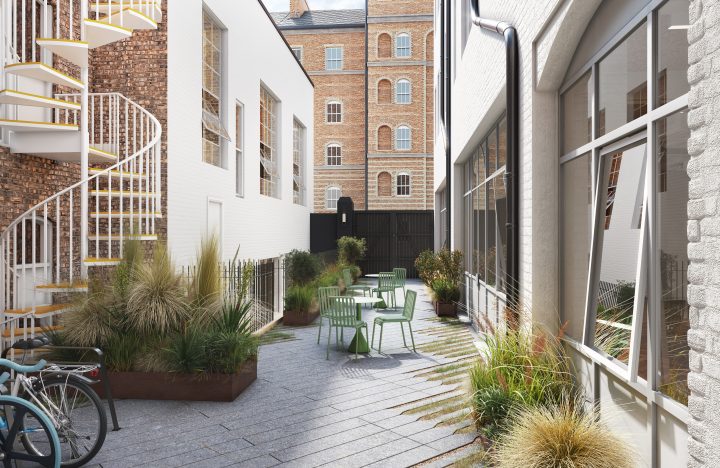 The existing structure is a six-storey wrought iron construction including a lower ground floor and basement vaults. To the rear a small courtyard and the 23 Clerkenwell Close Mews buildings are included within the site. The 23 Clerkenwell Close buildings are proposed to be opened up at their lowest level by removing existing masonry walls. To facilitate this new steel portal frames have been designed to provide stability and load bearing structure. A new mezzanine will be introduced in these buildings too which will be accessed by a lightweight steel stair.