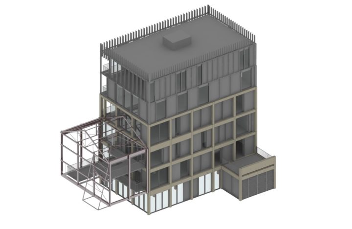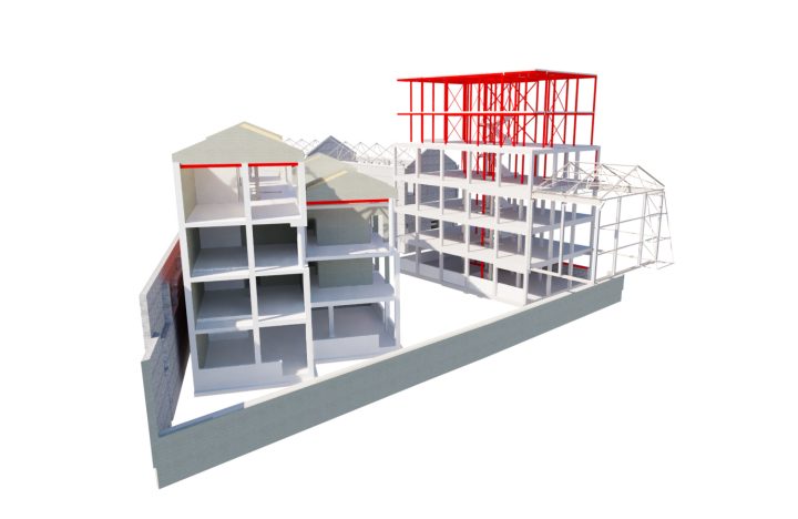 The existing warehouse was built in the 1960s, and extensive back analysis was carried out to determine its latent capacity. Due to its previous use as a warehouse, it was found that the change of use to a residential block provided enough capacity to allow for construction of two additional lightweight storeys with no requirement for strengthening the existing structure or foundations.
