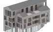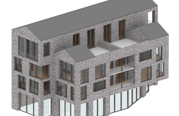 The second block of the development is a four-storey new-build concrete frame. The site was found to be heavily contaminated due to the previous industrial use, and the poor soil grade required extensive piling to support the structure. A transfer slab at first floor level achieves the long spans required for the commercial space below.