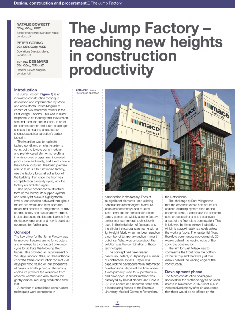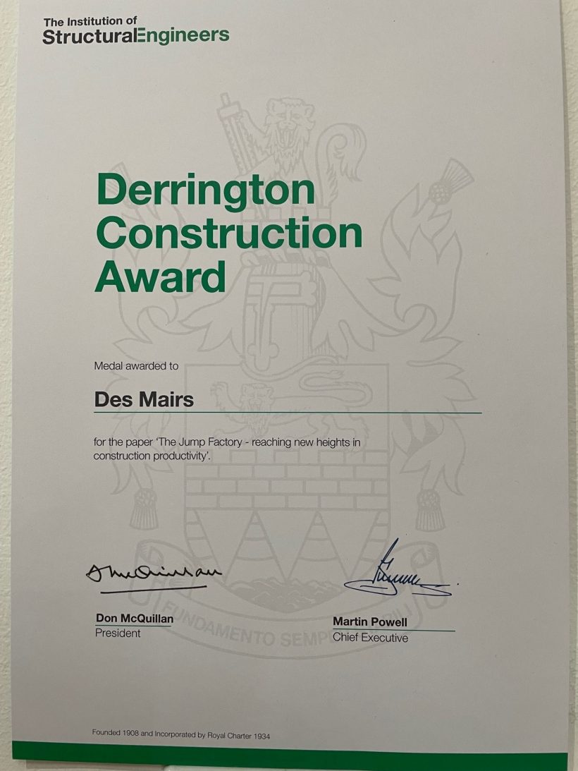 Congratulations to our very own Des Mairs on his recent win at the Institution of Structural Engineers awards. The award was for the article he wrote with MACE in the IStructE about one of our projects called ‘The Jump Factory – reaching new heights in construction productivity’.
