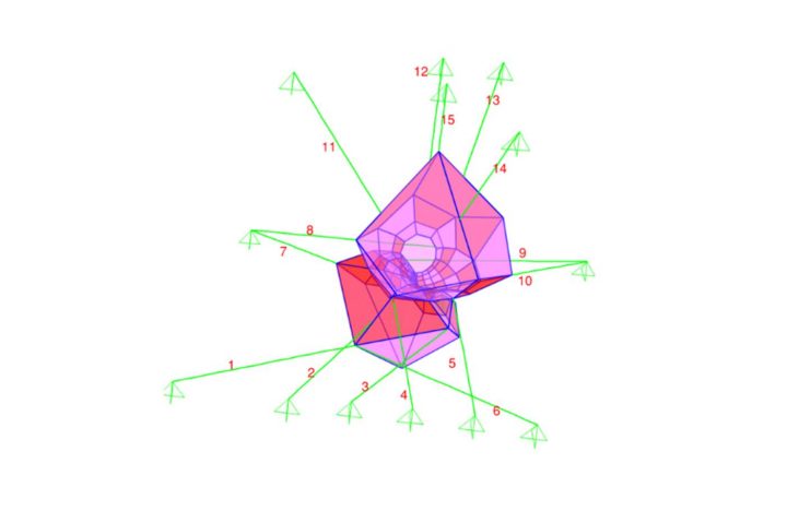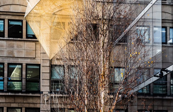 Architects Doone Silver Kerr invited IJP Architects and artist John Pickering to realise a suspended sculpture in the winter garden of 103 Colmore Row, a landmark mixed-use development by Sterling Property Ventures in Birmingham, UK. Just a few days before Pickering suddenly passed away at the age of 79, he invited George L. Legendre to carry out the project. Pickering and Legendre imagined the sculpture titled Equinox as a suspended, lightweight web of light structure in the mould of Sou Fujimoto’s Naoshima Pavilion (Japan, 2013). Davies Maguire were commissioned to undertake the structural design of the artwork.
