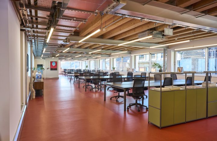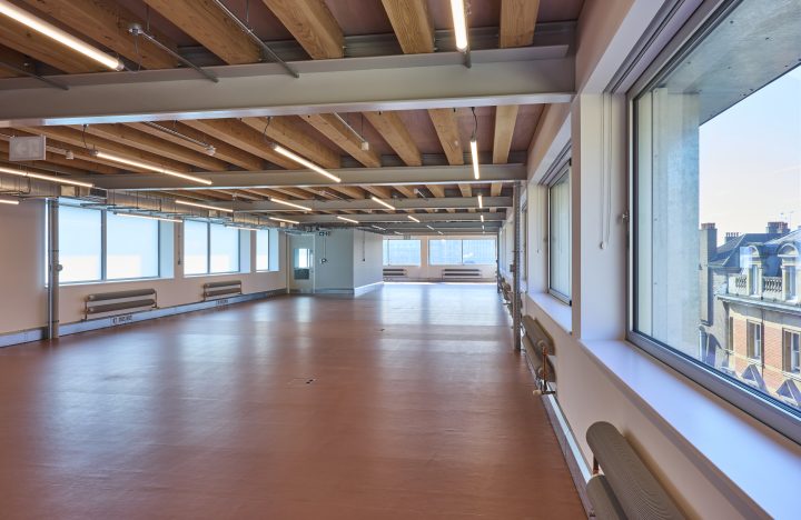 Existing TfL tunnels under the site meant that avoiding any foundation strengthening was a priority. Detailed geotechnical assessments were carried out in order to determine the allowable load increase on the existing foundations, minimising differential settlement and any associated impact on the buried infrastructure. To keep the loads low, the extension was designed as a lightweight steel structure with timber floors. The fire engineered timber is to be left exposed – both to minimise embodied carbon and to provide an aesthetically pleasing ceiling.