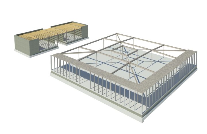 Mill Hide is a single-storey private residential building. The main structure features an inclined wide-trussed timber rafter roof with a 20-square-metre glazed skylight at its centre, all supported via an efficient steel frame. The sustainable and lightweight roof choice allowed for internal columns to be minimised, facilitating column-free spaces (upwards of 12 metres in span) to create a modern, open feel to the interior of the building.